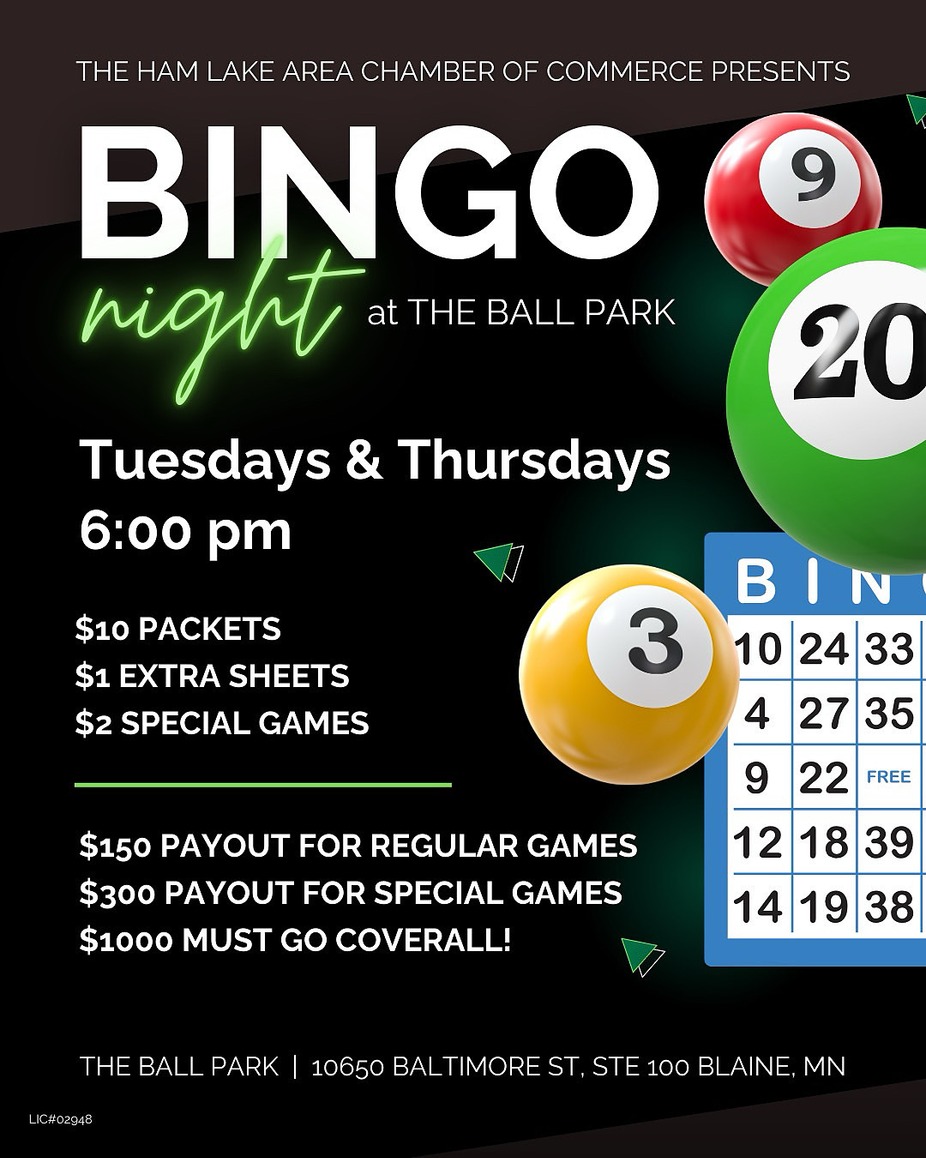 Join us for Bingo every Tuesday at 6pm. Come early to get a seat and enjoy a delicious dinner or Happy Hour from 2-6pm. $10 packets, $1 extra sheets, $2 special games. $150 payout for regular games, $300 payout for special games, $1000 must go coverall!
